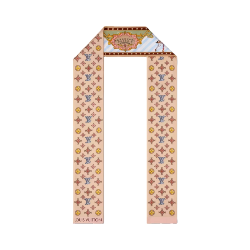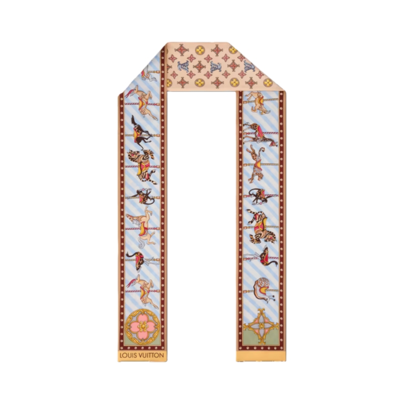 Crafted in the finest silk, the LV Carrousel bandeau captures the whimsical charm of carousels and childhood pleasures. Its artistic pattern depicts a row of colorful carousel animals punctuated with subtle Monogram Flower details. A unique, eye-catching accessory, perfect for bringing a touch of playful elegance to an everyday outfit.