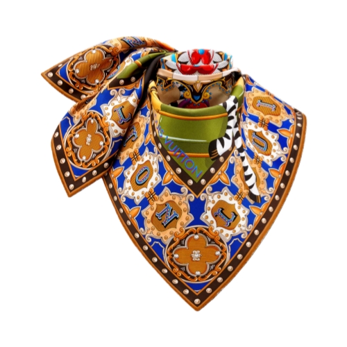 The all-silk LV Carrousel square brings the enchantment of childhood and fairground rides to life in a richly detailed design. Its artistic pattern features playful carousel and circus animal motifs in a palette of vibrant colors, framed by a distinctive Louis Vuitton signature border. Ideal for adding a whimsical touch of elegance to an everyday look.