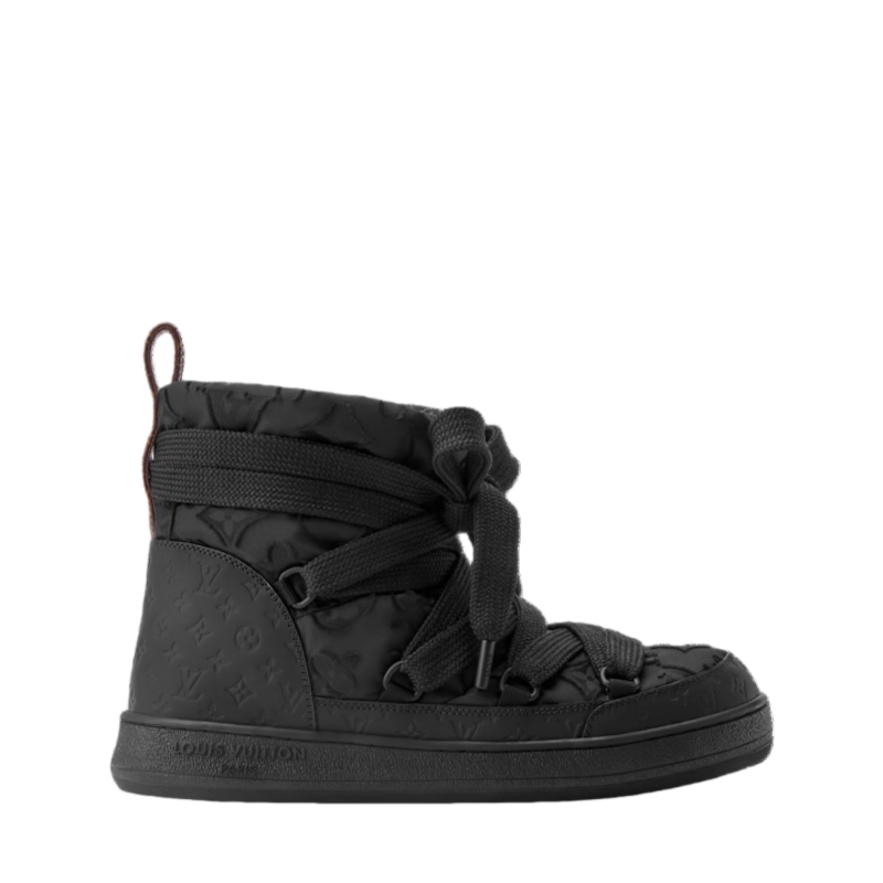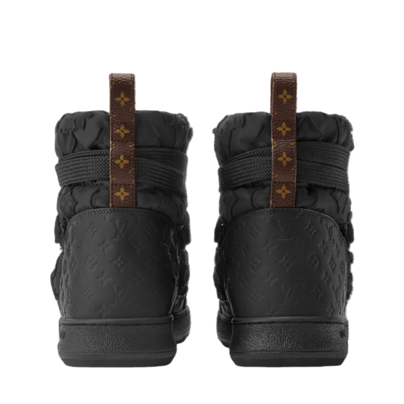 This refined interpretation of the LV Cloud lace-up ankle boot sneaker coordinates with the season's Ready-to-Wear collection. On the nylon upper, the Monogram pattern is revealed by a fil coupé technique, while it is also embossed on the rubberized calf-leather trim. The tone-on-tone rubber outsole and laces complete this design for a chic, all-black look.