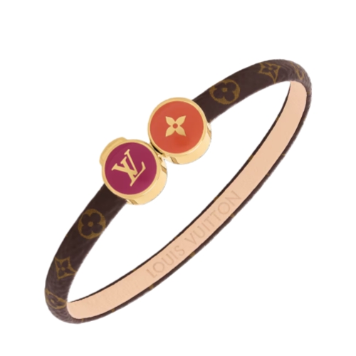 The casual-chic LV Confetti bracelet offers an eye-catching variation on the House’s beloved icons. Its Monogram canvas strap features a colorful metal and enamel closure in the form of two confetti-like disks adorned with a Monogram Flower and the emblematic LV Initials. This fun, easy-to-wear bracelet adds a playful creative accent to any look.