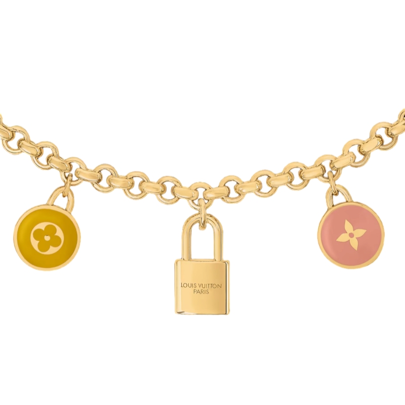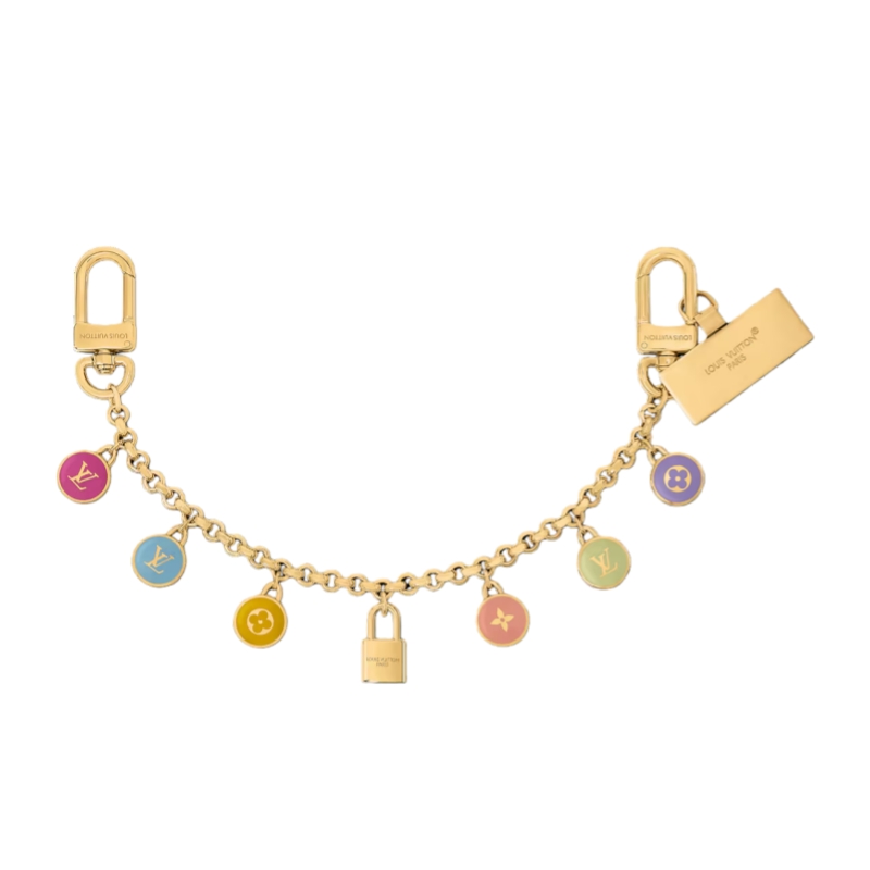 Inspired by nostalgic memories of childhood, the LV Confetti Chain bag charm expresses a spirit of youthful joy and creativity. Its fine-linked gold-toned chain holds an array of colorful disks adorned with the emblematic Monogram Flowers and LV Initials, plus a Louis Vuitton padlock. Perfect for adding a dazzling touch of signature style to a favorite handbag.