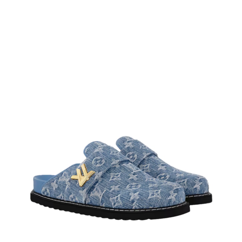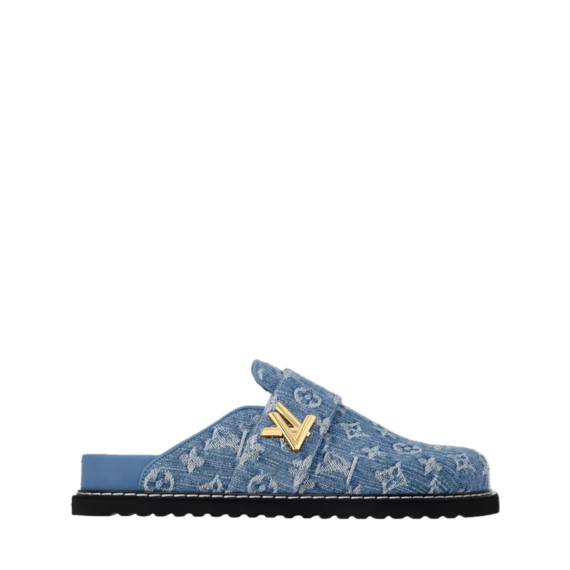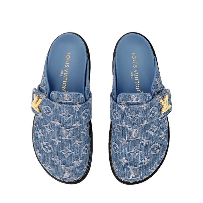 Monogram denim complements the relaxed design of the LV Cosy flat comfort clog. This easy-to-wear slip-on is elevated by refined details, including leather piping and an adjustable leather strap, which is signed with an LV Twist accessory. It has a comfortable anatomic footbed, which is covered in leather, and a lightweight micro outsole.