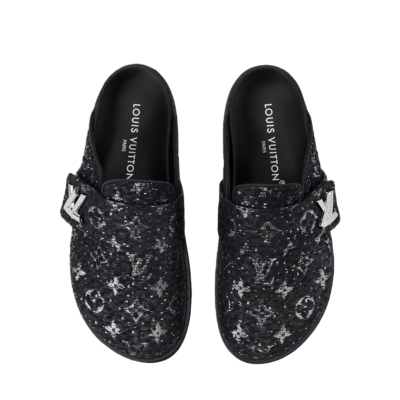 As part of the LV Ski capsule collection, the LV Cosy comfort clog is revisited in shimmering Monogram tweed for a relaxed yet glamorous look. The upper is signed with an LV Twist accessory in silver-toned metal. This effortless, slip-on style is finished with a comfortable anatomic insole and a lightweight micro outsole.