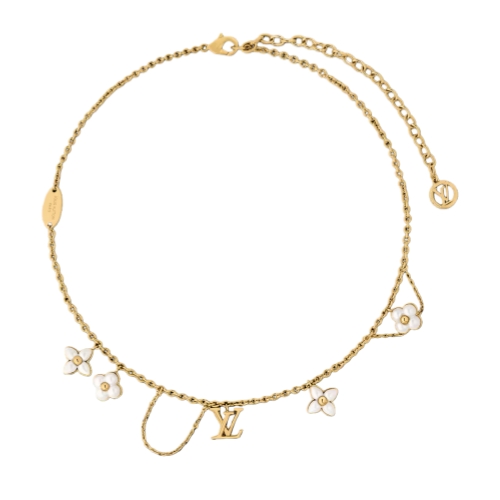 The LV Floragram necklace offers a unique blend of feminine chic and Louis Vuitton signature style. Its delicate gold-toned metal chain combines links of different sizes for a striking asymmetrical effect, accented with the LV Initials and four meticulously crafted Monogram Flowers. Ideal for adding a bright touch of sophistication to an everyday or more formal look.