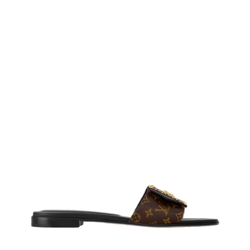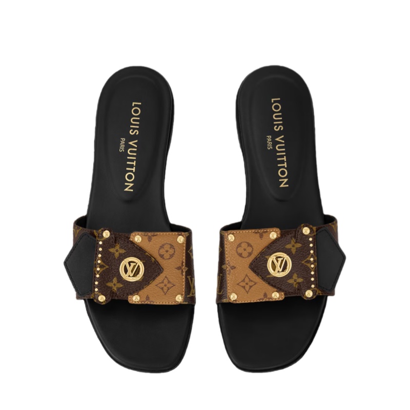 The LV Frame flat mule is a casual-chic style which pairs Monogram and Monogram Reverse canvas. It is notable for its wide front strap with a distinctive detail inspired by the closure of the Camera Box bag, which includes gold-tone studs and an LV Circle signature. This model is finished with a durable leather outsole.