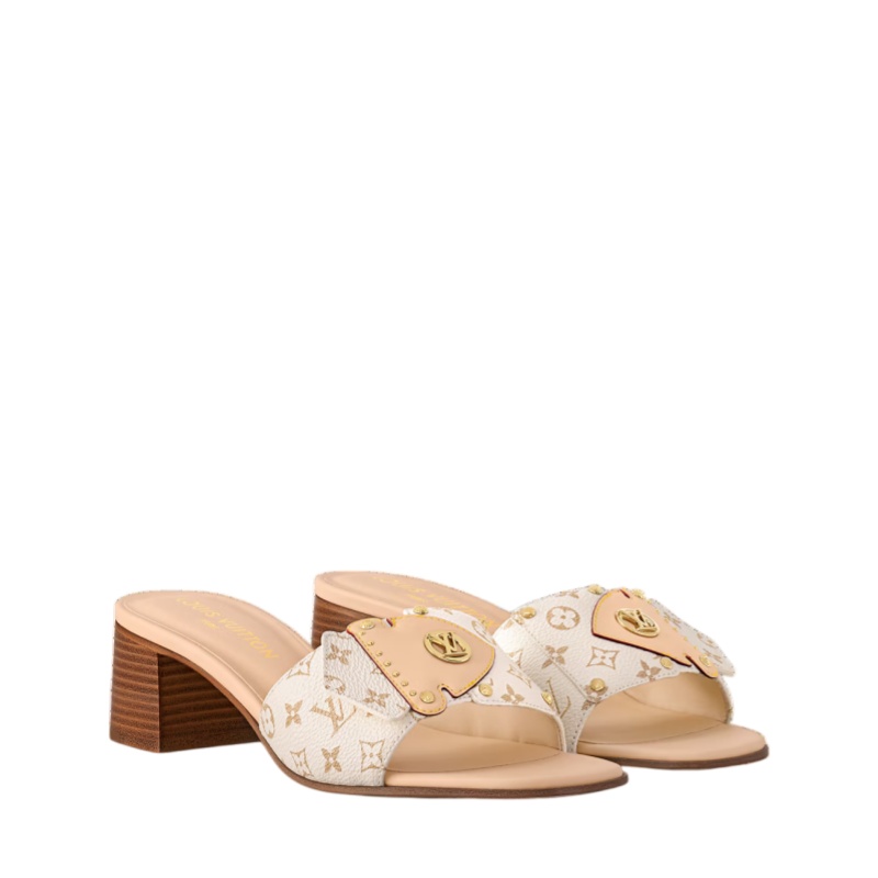 The LV Frame mule is a relaxed yet elegant style in Monogram canvas. Its front strap is embellished with a distinctive detail inspired by the Camera Box bag: a natural leather flap accessorized with gold-toned studs and an LV Circle signature. A low block heel and leather outsole complete this design.