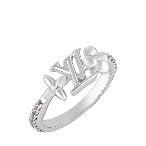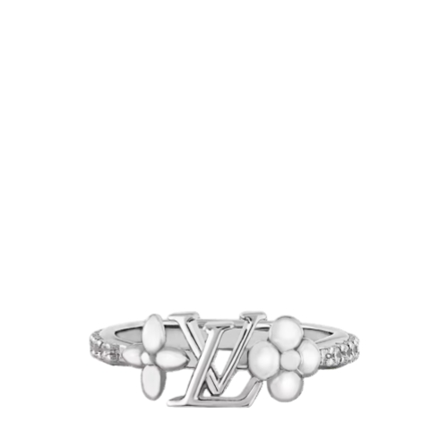 The strikingly elegant LV Iconic ring combines historic House emblems with the gleam of delicately set crystals. Styled in palladium-tone metal, it features the LV Initials flanked by two finely sculpted Monogram Flowers. A sophisticated ring with a unique signature presence.