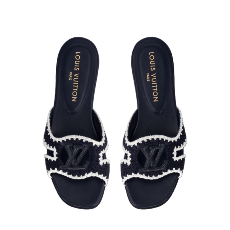 This seasonal edition of the LV Isola flat mule is made of cotton crochet, which gives it an intricate, hand-crafted look. The white detailing around the edges is mirrored by the LV Initials signature in white leather, which adorns the wide front strap. This stylish, summery design is finished with a fine leather outsole.