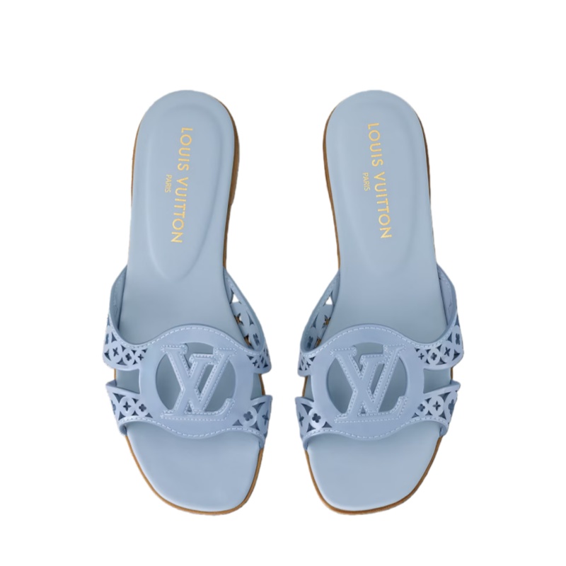 The LV Isola flat mule is revisited this season in patent calf leather with intricate Monogram Flower perforations. The key detail of the LV Isola line is the large LV Circle signature on the strap, which is cut out of the leather. This casual-chic style is finished with a fine leather outsole.