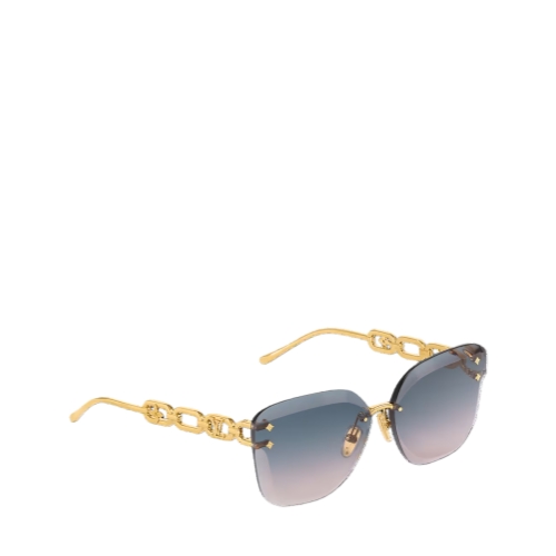 Delicate rimless lenses combine with bold chain-effect temples to give the LV Jewel Cat Eye sunglasses their unique look. Classic House signatures are revealed in subtle details throughout this pair. The iconic LV Initials are incorporated into the chain link design while hand-polished Monogram Flower studs adorn the smoky gradient lenses.