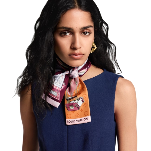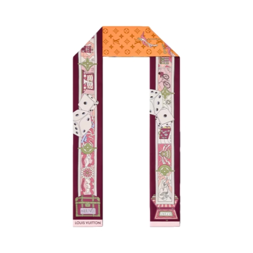 With its playful, intricate design, the LV Journey silk bandeau combines fine craftsmanship with a subtle House signature. Its strikingly creative print mixes Monogram motifs with evocations of travel and games, like trunks, bags and dice. At once contemporary and timeless, it is destined to become an iconic accessory.