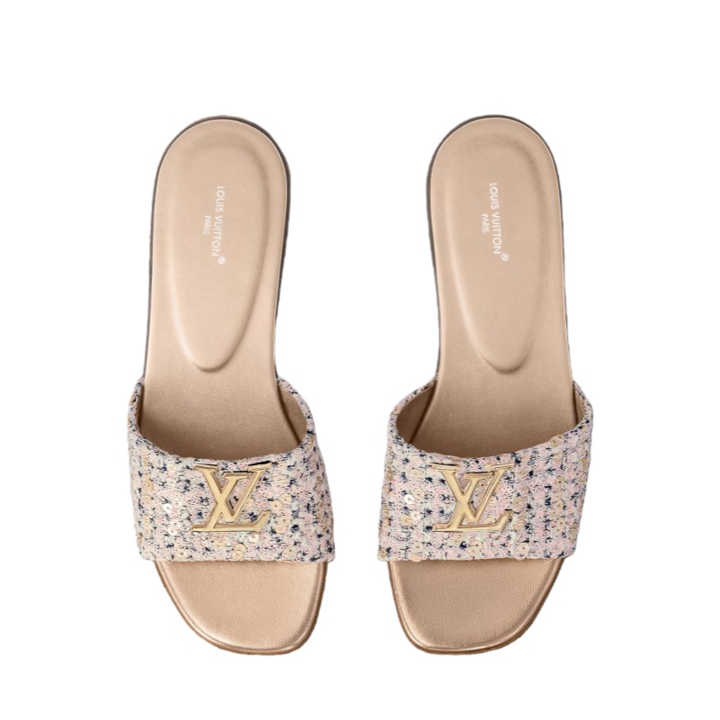 The LV Mare flat mule is revisited this season in shimmering, sequin-embellished tweed, reflecting a key theme of the Louis Vuitton Cruise 2025 collection. This relaxed yet refined model is distinguished by its wide front strap, which is signed with an LV Initials accessory inspired by the clasp of the House's iconic Capucines bag.