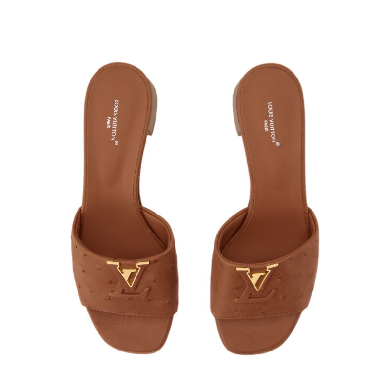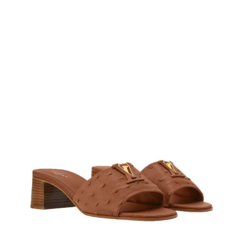 Ostrich leather with a distinctive matte finish complements the refined design of the LV Mare mule. Both elegant and easy to wear, this model comes on a low block heel. The wide front strap is embellished with an LV Initials signature in leather and gold-toned metal, which references the emblematic Capucines bag.