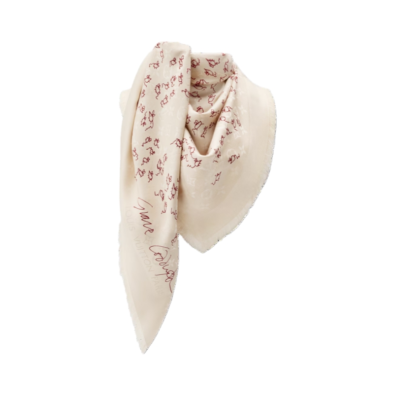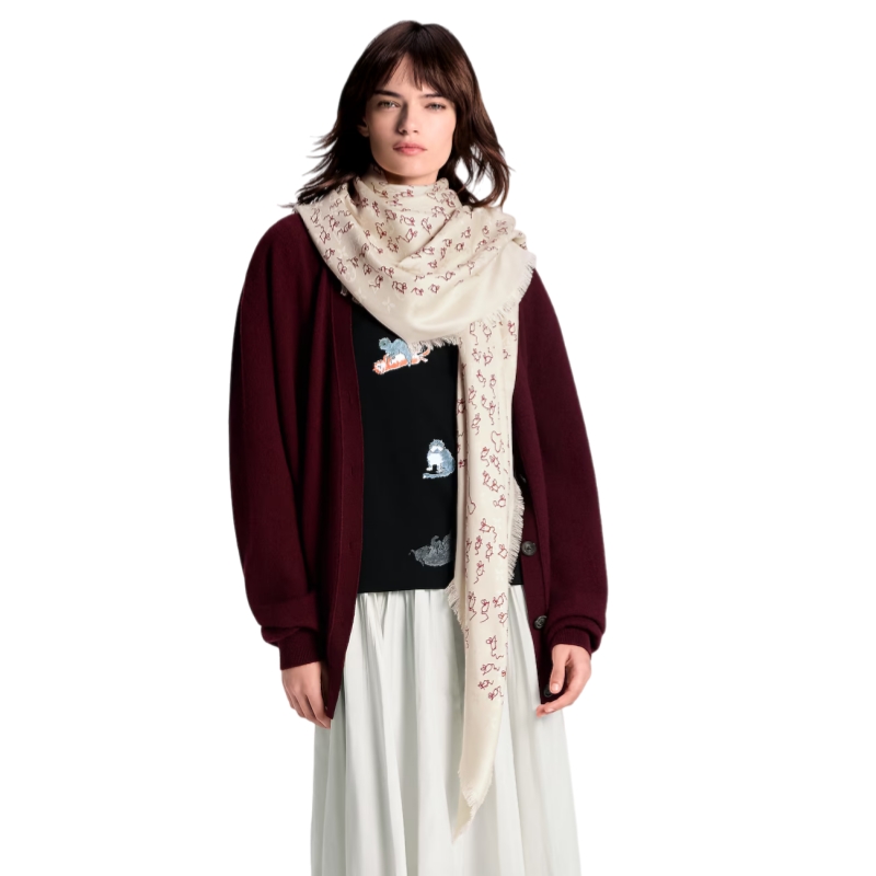 As part of her exclusive collaboration with Louis Vuitton, the stylist and fashion icon Grace Coddington created the pattern for the LV Mice Monogram Classique shawl. Against a jacquard-woven Monogram background, a whimsical print of playful mice showcases Grace’s talent as an illustrator. Crafted in a sumptuous silk-wool blend, this comfortable, elegant shawl adds an original creative touch to any look.
