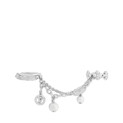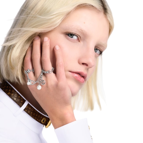 Expertly crafted in palladium-toned metal, the LV Mix Chains ring set offers three jewels in one. Designed to be worn on three fingers, it mixes different-sized chains with House emblems like the Monogram Flower and LV Circle, plus luminous glass pearls. Ideal for everyday or special occasions, it adds an eye-catching touch of originality to any look.