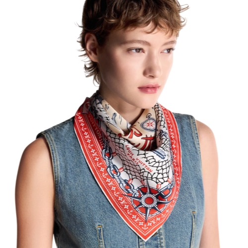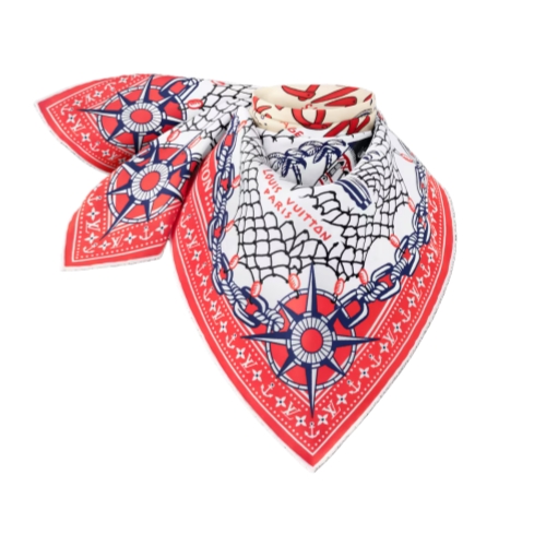 The all-silk LV Ocean Treasure Map square is a celebration of the House’s devotion to travel. Its intricately detailed pattern combines nautical images with signature icons like classic trunks and an exotic version of the historic Louis Vuitton house in Asnières. A blend of vintage charm and contemporary elegance, perfect for urban adventurers or global explorers.