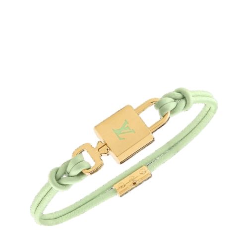 The LV Padlock bracelet pays homage to the House's trunk-making history. A padlock featuring an engraved LV signature sits at the center, held securely in place by a Monogram canvas strap. A removable key opens the bracelet, giving the piece a special yet functional touch.