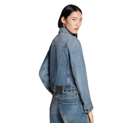This jacket is a timeless staple in washed denim detailed with yellow topstitching to highlight the construction. It is cut in a straight shape with a collar and two chest pockets, one of which is embellished with a seasonal LV sun patch. A Monogram canvas accent adds a final signature to the back of the waistband.