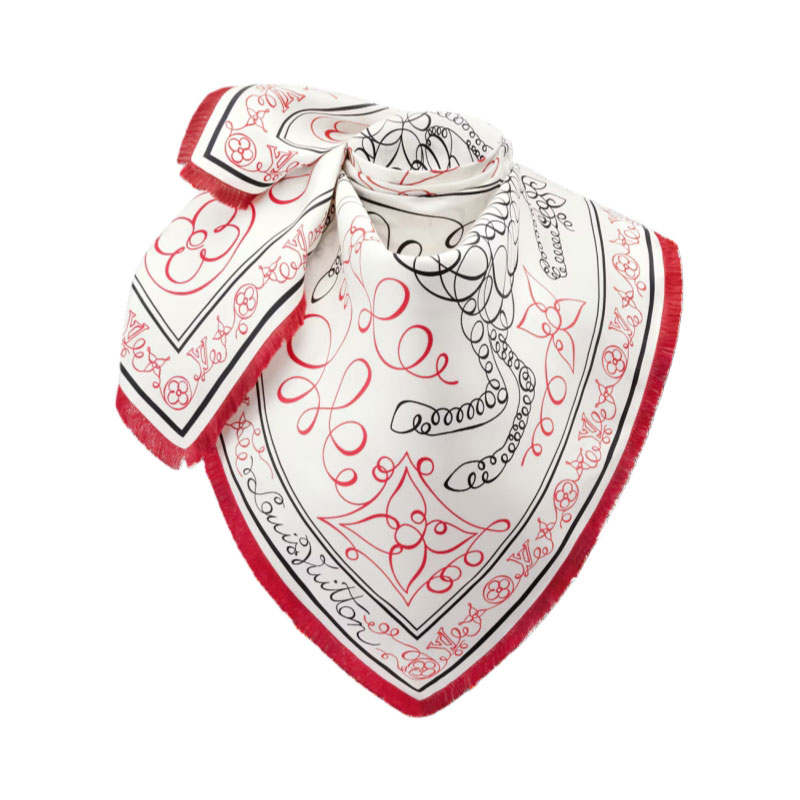 Specially created for the Year of the Horse, the all-silk LV Ride Away square is a stylish, sophisticated accessory charged with symbolism. Its eye-catching design depicts four frolicking horses around an outsized Monogram Flower and an LV Circle signature, all in an artistic calligraphic style. Perfect for Louis Vuitton fans who celebrate the Lunar New Year.