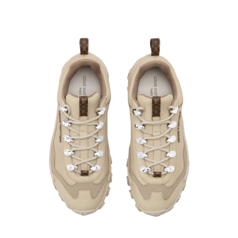 The LV Rush Xplorer sneaker comes in supple, grained calf leather with details in suede and rubberized leather. This model is characterized by its chunky yet lightweight outsole with a distinctive wavy design and an LV Circle signature. The upper is complemented by technical laces and Monogram-canvas loops at the front and back.