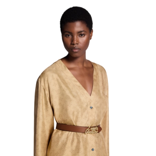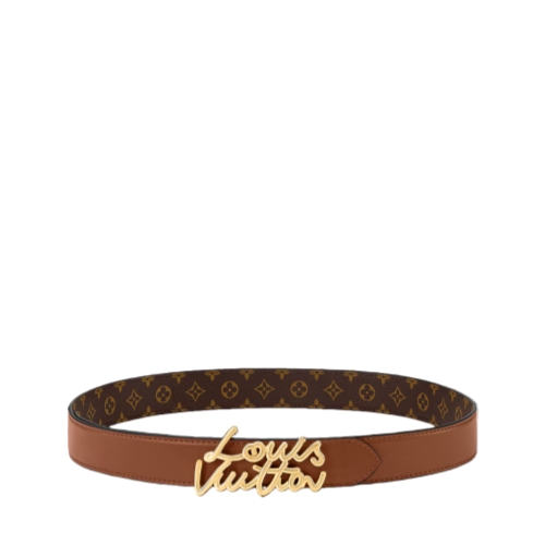 The reversible design of the LV Script belt offers a choice of sumptuous calfskin or the House’s iconic Monogram canvas. Its centerpiece is an outsized buckle crafted in gleaming gold-colored metal, spelling out the Louis Vuitton signature in a sleek hand-written style. Ideal for both casual and formal occasions, this versatile belt emanates sophistication and timeless elegance.