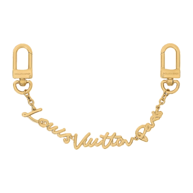 The sophisticated, on-trend LV Script Chain bag charm features a distinctive House signature that elevates both everyday and more formal looks. Suspended between twin snap hooks, a gleaming gold-colored chain spells out Louis Vuitton Paris in a fluid hand-written style. A sleekly elegant charm and an eye-catching expression of personal style.