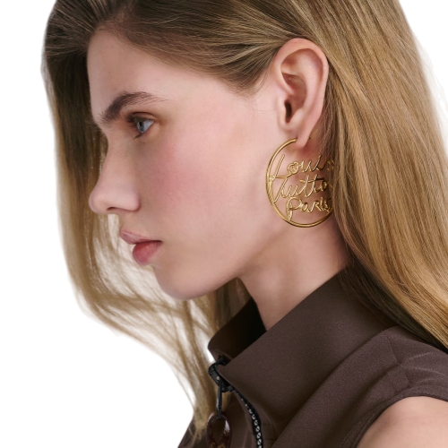 The stylish and sophisticated LV Script earrings feature a distinctive House hallmark spotlighted in the Spring-Summer 2025 runway show. Their unique design combines slim gold-colored metal hoops with a Louis Vuitton Paris signature crafted in an elegant, fluid hand-written style. Lightweight and easy to wear, these on-trend earrings are perfect for all occasions.