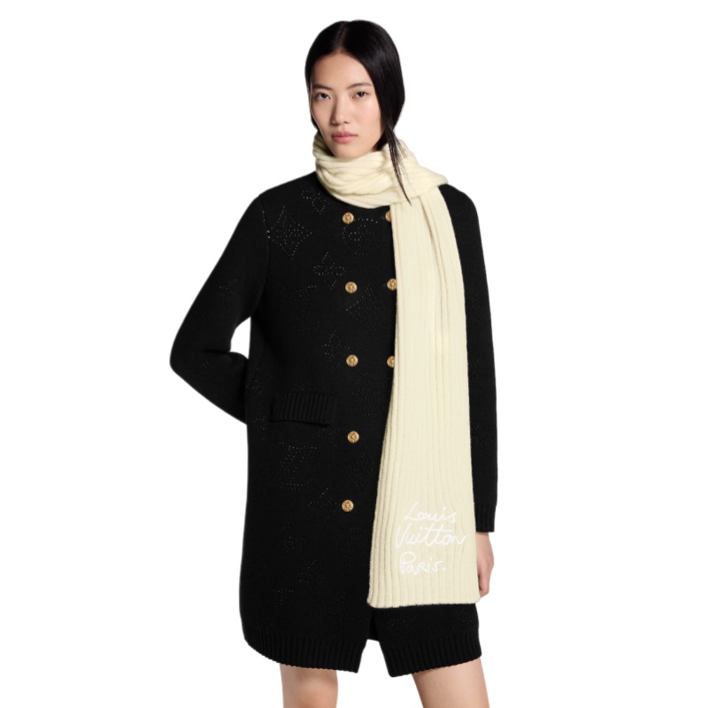 Seen on the catwalk, the LV Script scarf features a sleek, contemporary Louis Vuitton signature. Plush mohair is adorned with the name of the House in a smooth, flowing hand-written style. This ultra-comfortable scarf adds a playful, youthful touch to a winter wardrobe – perfect for keeping the neck and shoulders delightfully warm all winter long.