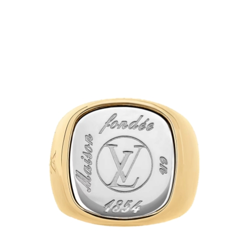 The distinctive design of the LV Signet ring offers an original blend of contemporary elegance and timeless heritage. Its chunky gold-toned band is adorned with a palladium-colored signet inspired by the LV Circle emblem, meticulously engraved with historical details. This precious ring expresses a strong identity rooted in the House’s rich history.