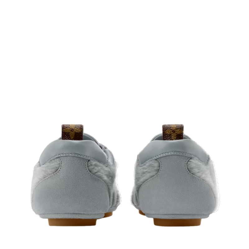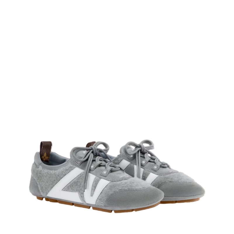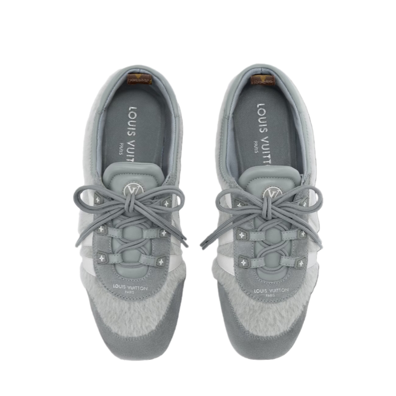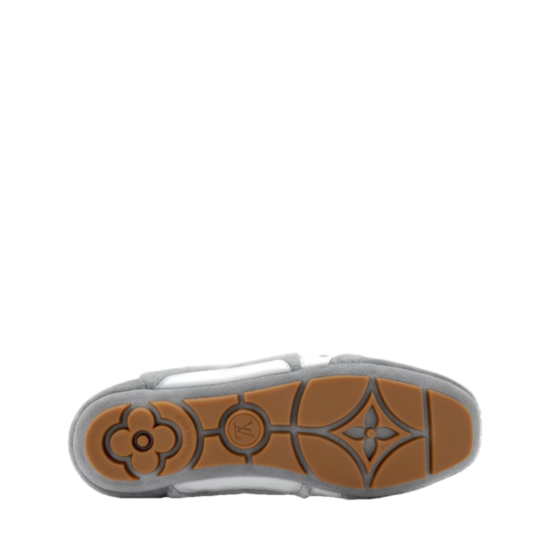 This version of the LV Sneakerina sneaker ballerina comes in soft, woolly fabric with coordinating suede calf-leather trim. Combining the qualities of a sneaker and a ballet pump, this model features a supple sacchetto construction for comfort and lightness. It is finished with double laces and House signatures, including a dynamic LV on the side.