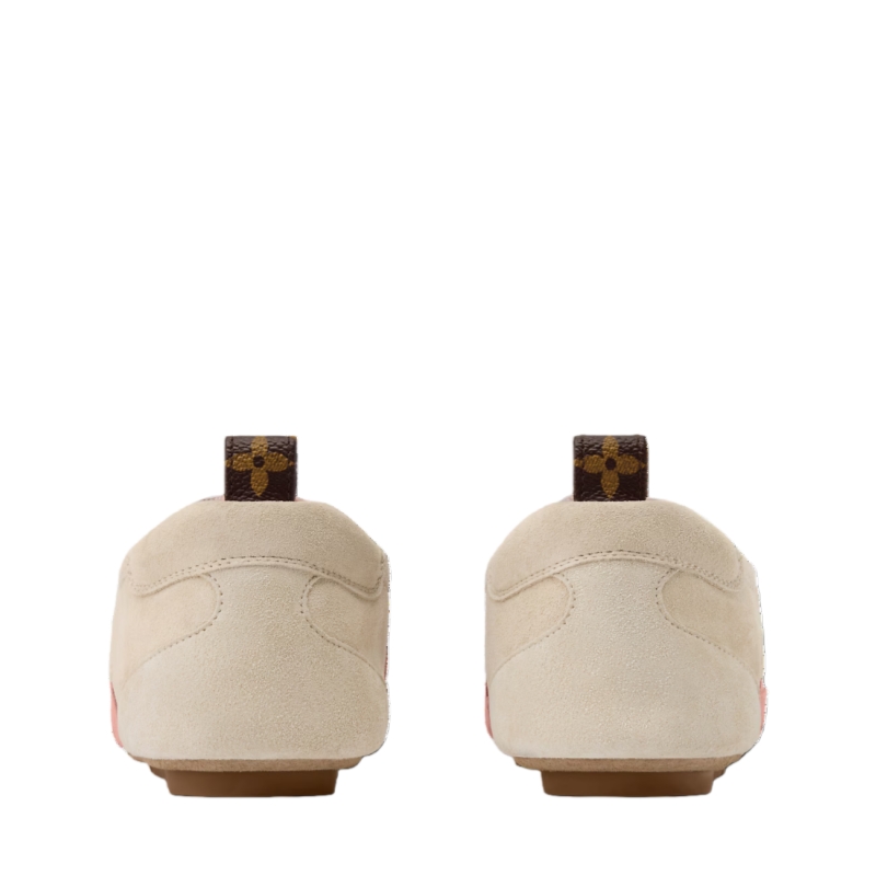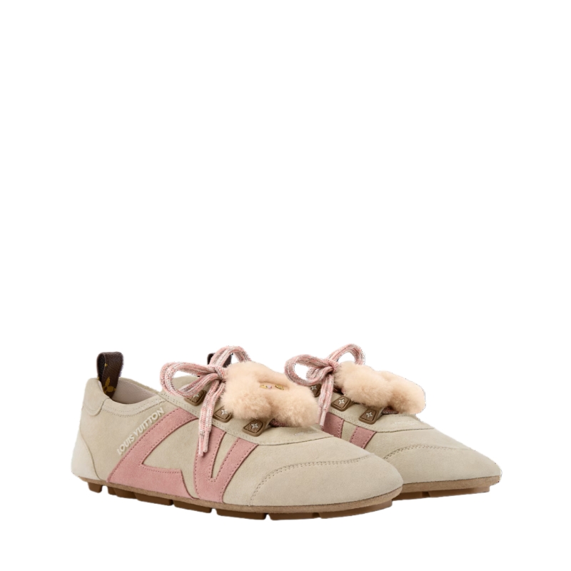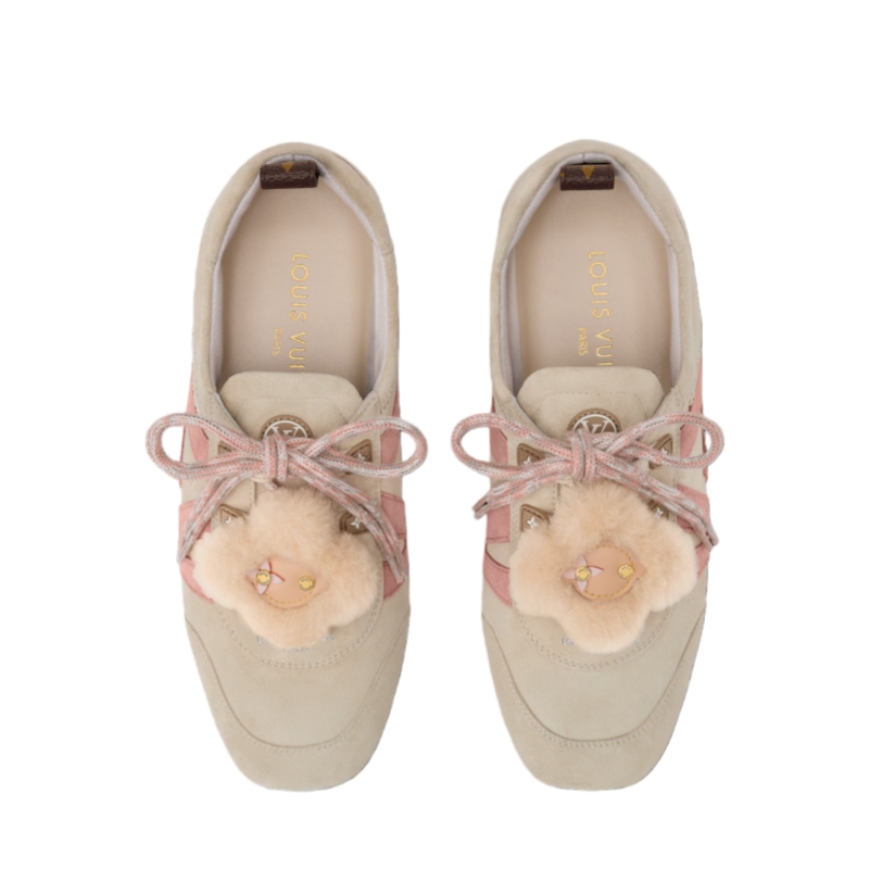 This edition of the LV Sneakerina sneaker ballerina is made of soft suede calf leather. Its laces are embellished with a delightful accessory: a fluffy tag representing the House's Vivienne mascot. This model, a sleek combination of a sneaker and a ballet pump, features a supple sacchetto construction and a lightweight injected TPU outsole with signature details.