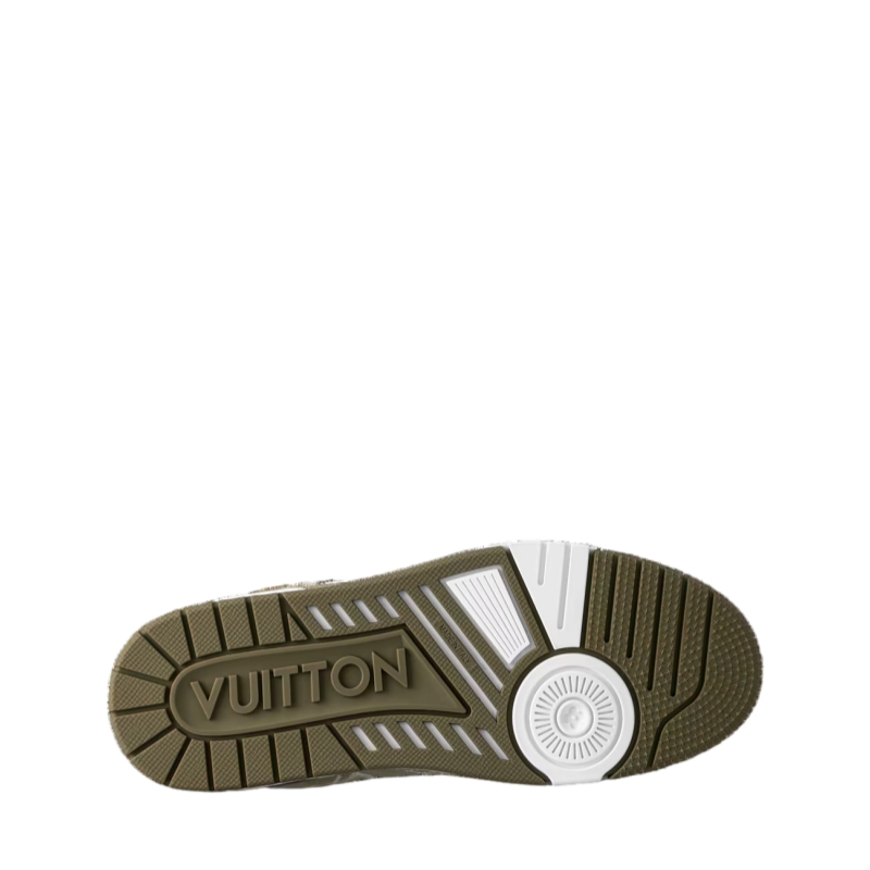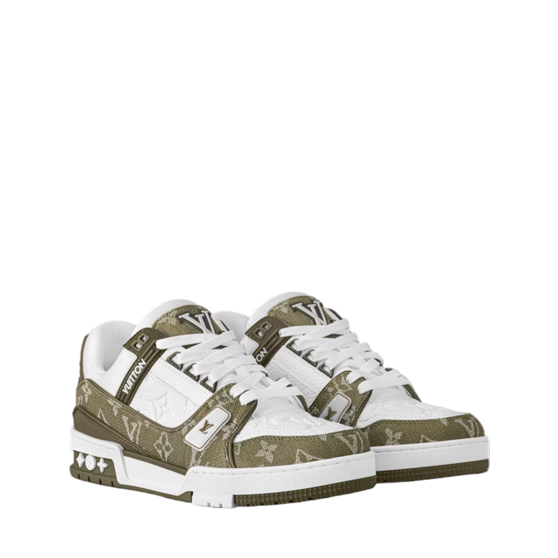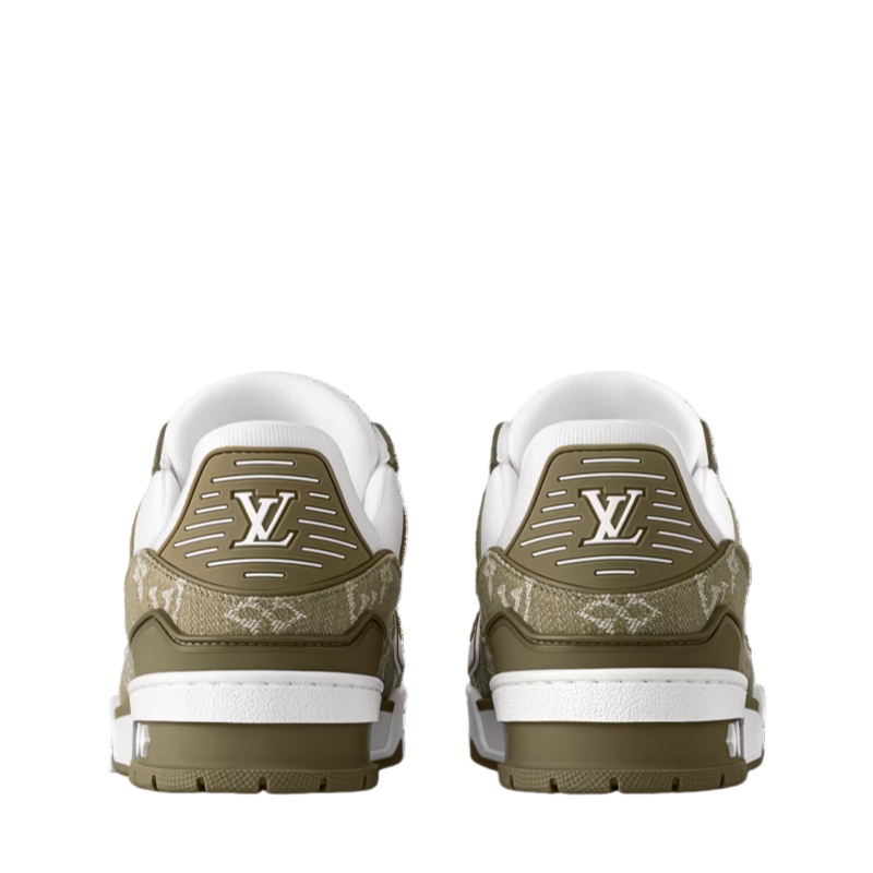 For the first time, the cult LV Trainer sneaker, a staple of the men's collection, is revisited for women in calf leather and Monogram denim. This classic design, created by Virgil Abloh, references vintage basketball sneakers. It features numerous signature details, including the LV Initials on the tongue and side, and Monogram Flowers on the outsole.