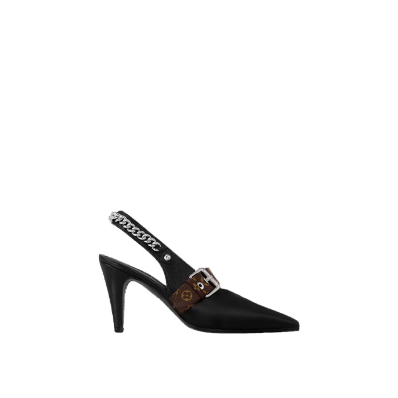 The sleek design of the LV Vibe slingback pump is complemented by soft lambskin. This model is notable for its pointed toe and high, leather-covered heel, as well as for its distinctive details: a decorative, belt-like strap in Monogram canvas at the front and a silver-toned chain and engraved studs on the elasticized back strap.