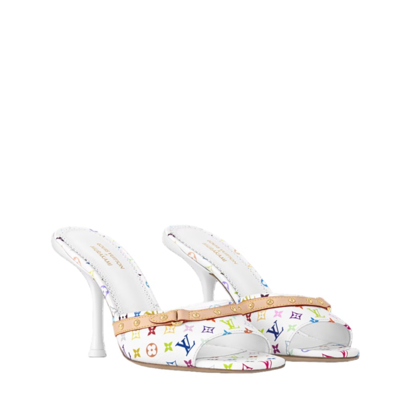 The 6AM mule is effortlessly sophisticated in a slender stiletto silhouette. A multicolored Monogram motif from the re-edition of the Louis Vuitton x Murakami collection adds a playful allover signature inspired by the Japanese artist’s vibrant aesthetic, while the wide front strap is detailed with a slim natural cowhide leather trim studded with gold-toned hardware for a rebellious finishing touch.