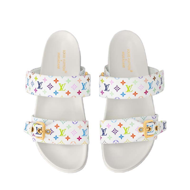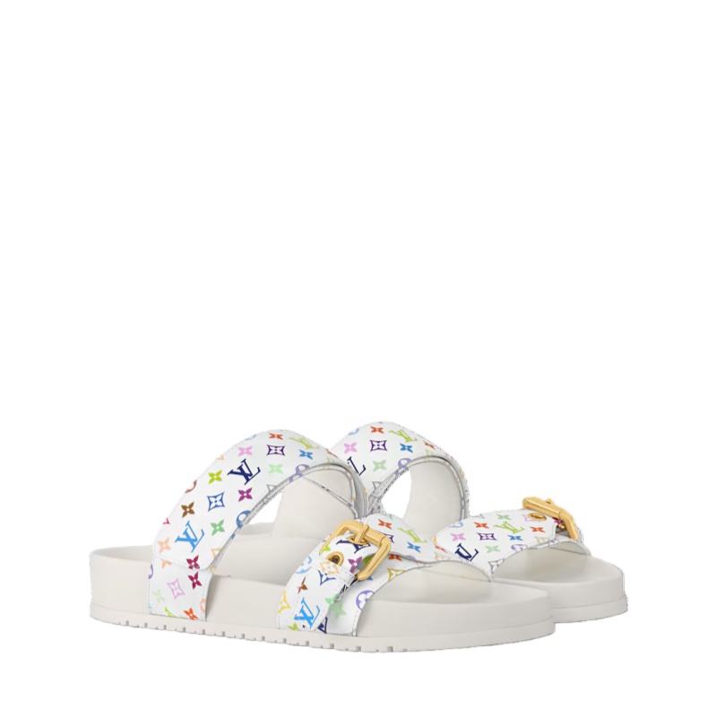 The Bom Dia comfort mule is crafted from Monogram Multicolore canvas, a joyful interpretation of the iconic Louis Vuitton Monogram by Japanese artist Takashi Murakami. This relaxed model has two adjustable straps: one with a gold-toned buckle and eyelets, the other with velcro. Its anatomic footbed and rubber outsole provide all-day comfort.