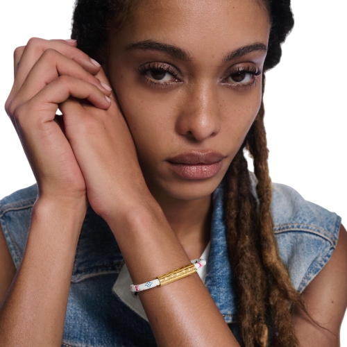 The season’s Louis Vuitton x Murakami collection features this edition of an iconic design: the LV x TM Confidential bracelet. Revisited by the renowned Japanese artist, heritage Monogram canvas becomes Monogram Multicolor, printed with the emblematic motif in a rainbow of 33 hues. The closure is crafted from gold-tone metal, engraved with the Louis Vuitton signature. A perfect choice to mix and stack with other pieces from the collection.