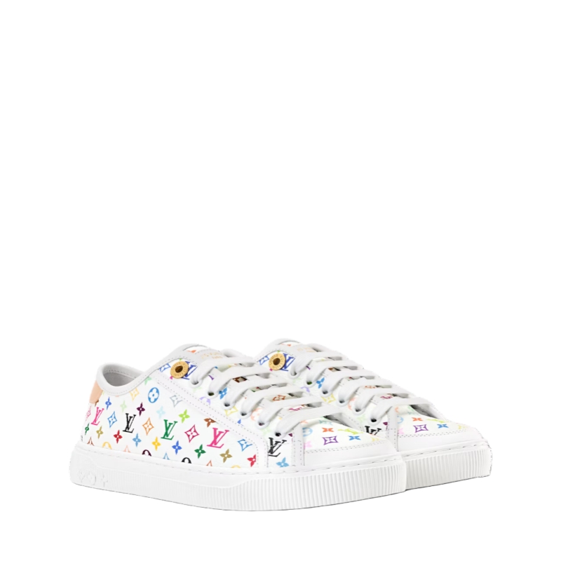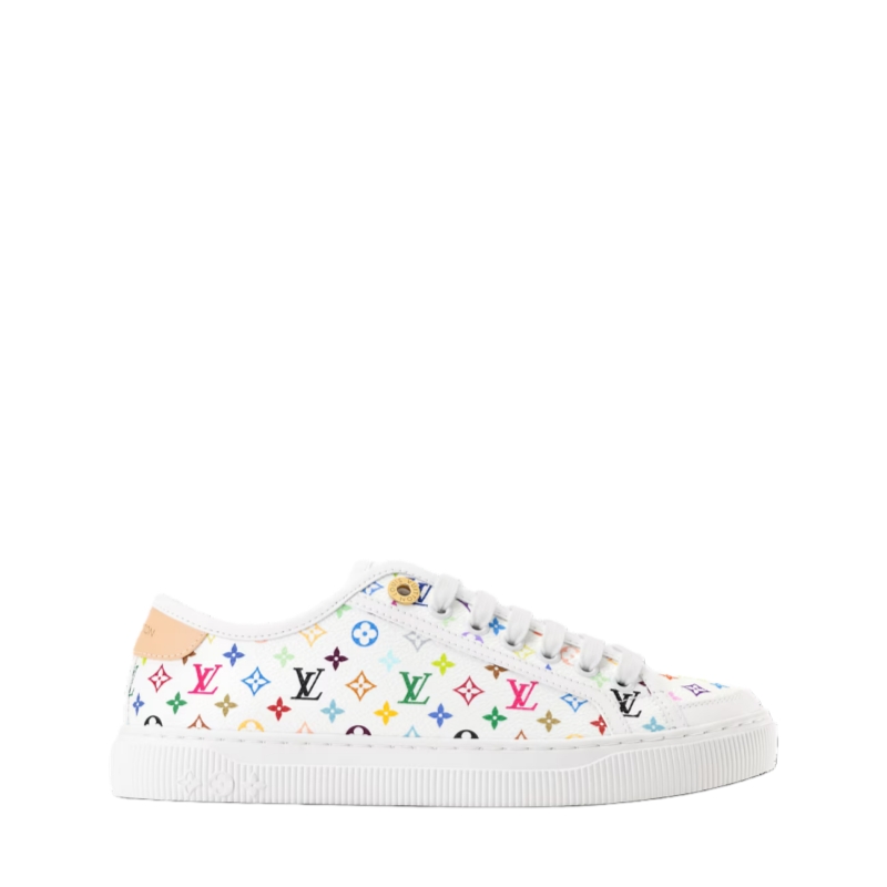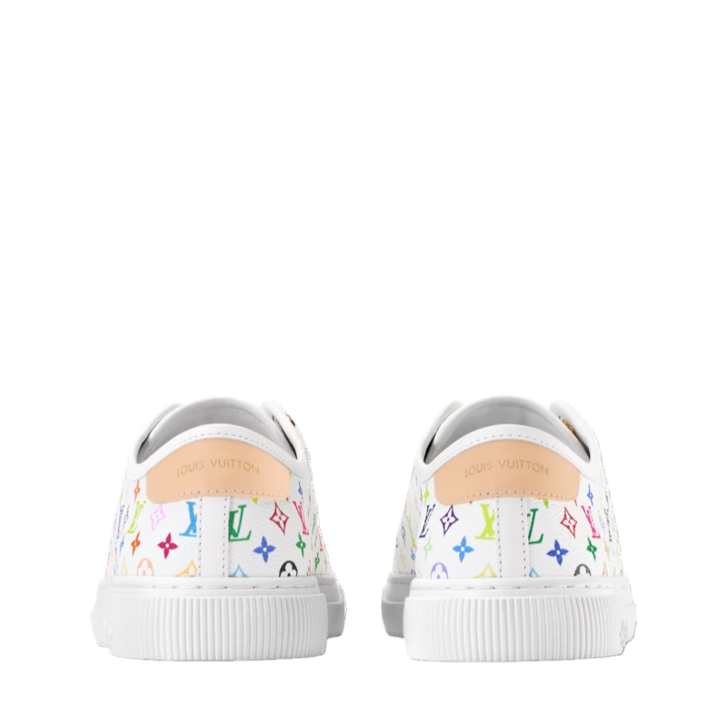 Monogram Multicolore canvas, created by Japanese artist Takashi Murakami, brings a pop twist to the LV Lagoon sneaker. This stylishly simple design is elevated by refined details, such as trim in the House's emblematic natural leather and engraved, gold-toned eyelets. It is finished with a lightweight rubber outsole decorated with Monogram Flowers.