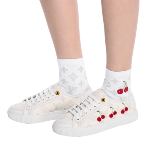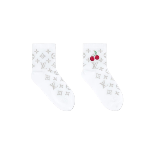 With their original, whimsical design, the LV x TM Monogram Cerise socks are a fun addition to the exclusive re-edition of the Louis Vuitton x Murakami collection. A subdued Monogram pattern is accented with a pair of embroidered colorful Murakami-style cherries, a symbol of beauty and happiness. Styled in cotton fiber with embroidered cherry, these ultra-comfortable socks add a playful signature touch to a casual outfit – perfect for everyday wear.