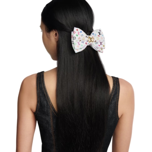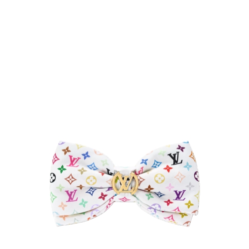 The LV x TM Monogram Multicolor Bow barrette features a unique, artistic Louis Vuitton signature that has become a contemporary classic. Its bow is adorned with a playful multicolored version of the Monogram pattern by the renowned Japanese artist Takashi Murakami. An LV Circle emblem adds an extra House accent to this fun, eye-catching accessory.