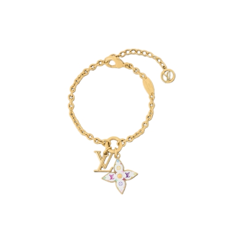 A creative variation on a House icon by the world-famous Japanese artist Takashi Murakami gives the LV x TM Monogram Multicolor bracelet an original signature look. Its gold-toned chain holds a Monogram Flower charm enlivened with Murakami’s playful take on the Monogram motif, plus a colorful LV Initiales emblem. This fun, eye-catching jewel is sure to become a collector’s piece.