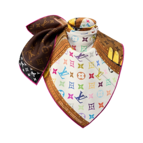 The striking design of the LV x TM Monogram Multicolor Collector square was inspired by the House’s high-profile collaboration with the renowned Japanese artist Takashi Murakami. Crafted in sumptuous silk, it depicts iconic luggage creations adorned with the classic Monogram pattern or Murakami’s upbeat, brightly colored reinterpretation. An original, stylish way to wear a timeless Louis Vuitton look.