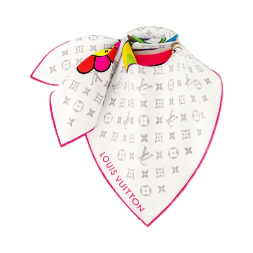 Elegance and whimsy combine in the LV x TM Monogram Superflat square, a striking new accessory from the Maison’s latest collaboration with Japanese artist Takashi Murakami. Printed in vibrant colors against an allover tonal Monogram background, the oversized LV Hands logo is abloom with smiling flowers and House motifs, rendered in Murakami’s signature Superflat technique. With its generous dimensions this versatile, pure-silk scarf invites a host of creative styling options.