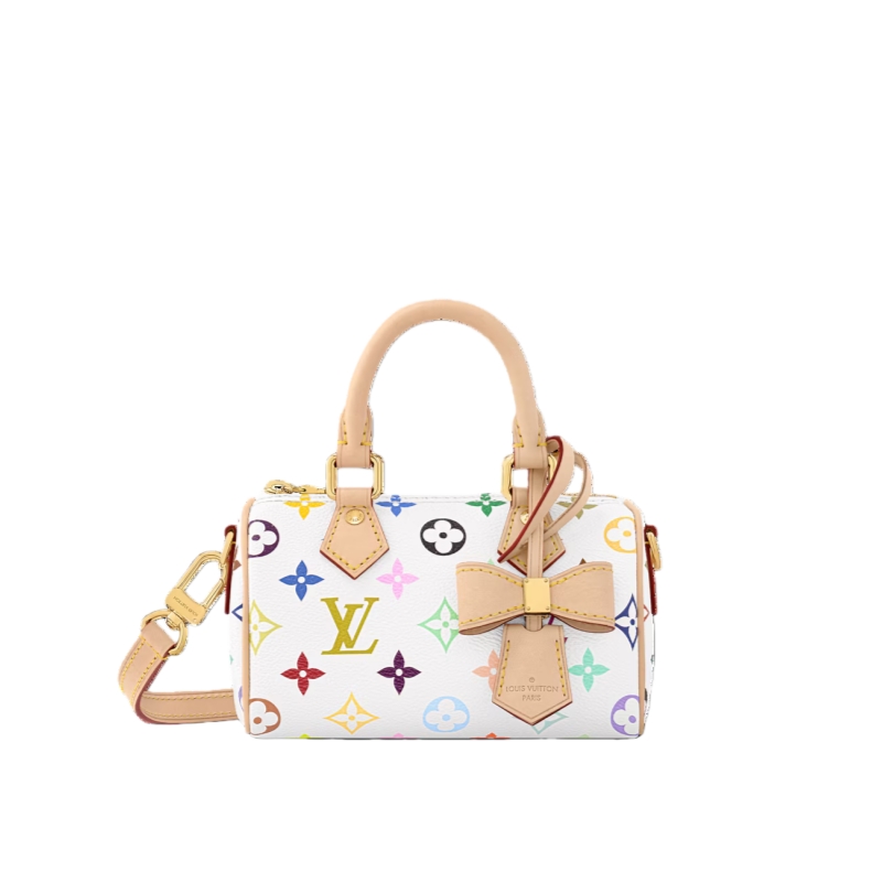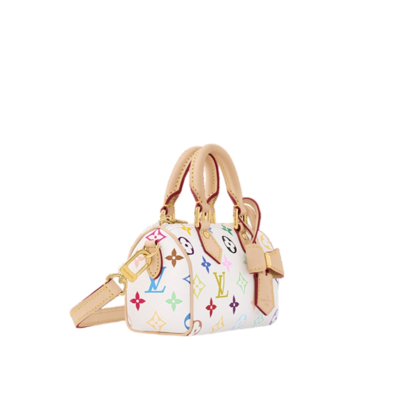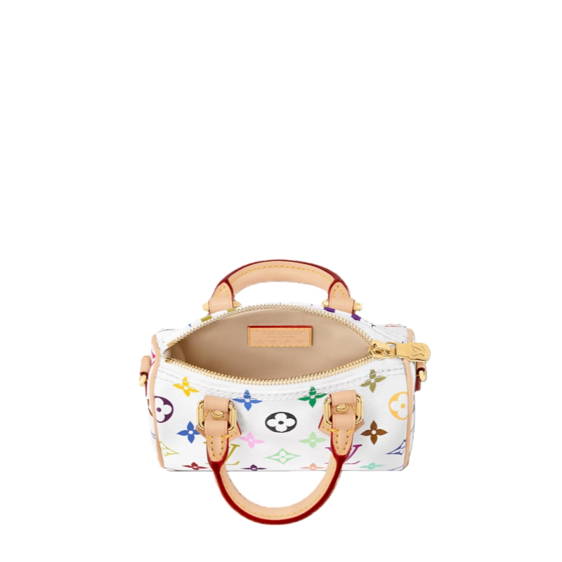 The scaled-down Nano Speedy makes a playful statement in Monogram coated canvas, which has been reworked in upbeat tones as part of the re-edition of the Louis Vuitton x Murakami collection. Natural cowhide leather trims add a timeless touch, as do two Toron top handles and a gleaming golden padlock in homage to the House’s travel heritage. Complete with a removable, adjustable strap and an exclusive LV x TM keybell.