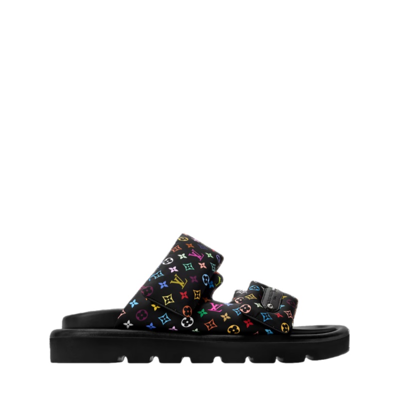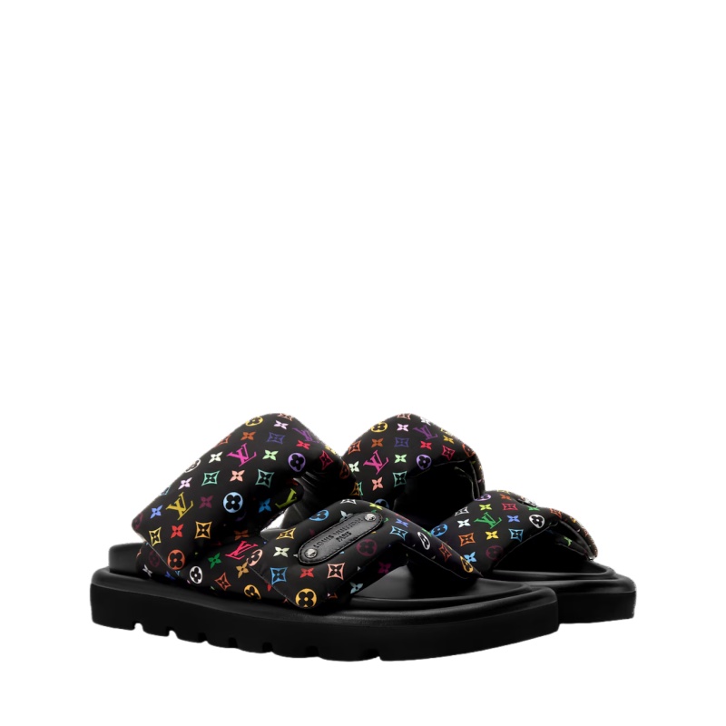 The Pool Pillow comfort mule is revisited in nylon printed with the joyful Monogram Multicolore pattern designed for the House by Japanese artist Takashi Murakami. This model features two puffy, pillow-like velcro straps, one of which is embellished with a natural leather label bearing the Louis Vuitton signature. It is finished with a lightweight micro outsole.