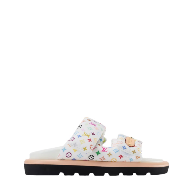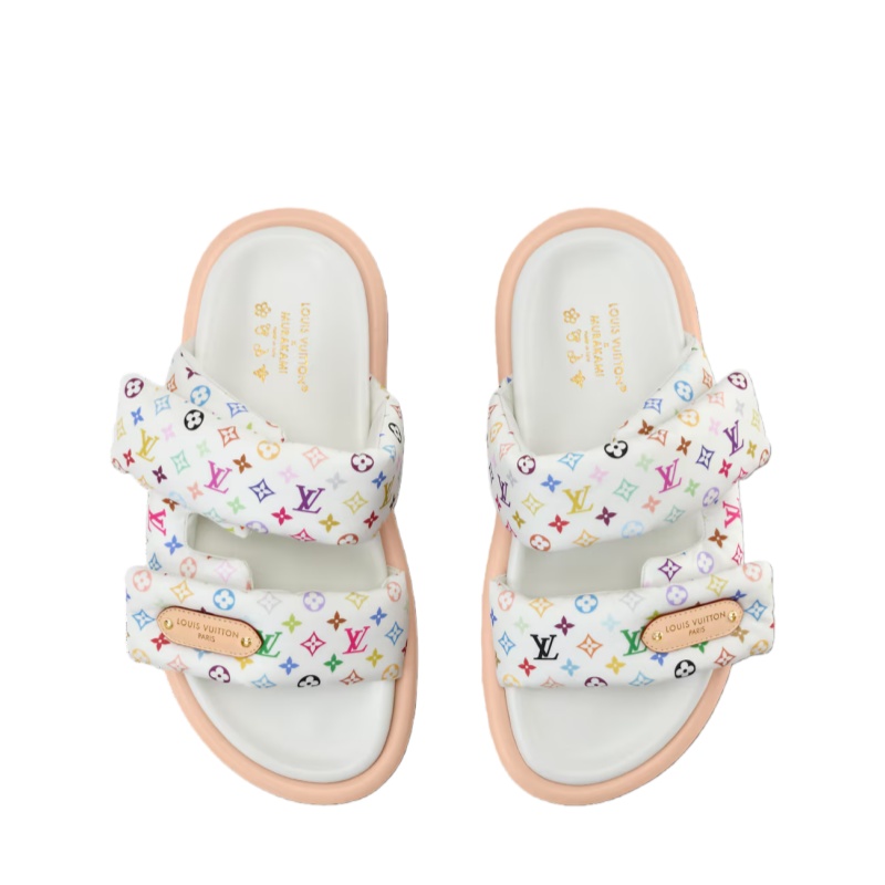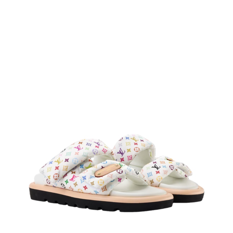 The Pool Pillow comfort mule is revisited in nylon printed with the joyful Monogram Multicolore pattern designed for the House by Japanese artist Takashi Murakami. This model features two puffy, pillow-like velcro straps, one of which is embellished with a natural leather label bearing the Louis Vuitton signature. It is finished with a lightweight micro outsole.