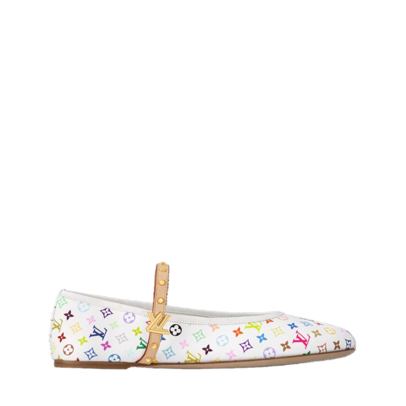 The Romy flat ballerina pump makes a playful statement in a multicolored Monogram motif from the re-edition of the Louis Vuitton x Murakami collection, which twists the House’s iconic signature with bold rainbow tones inspired by the artist’s go-to palette. Crafted from coated canvas with a supple leather outsole, they are lightweight and comfortable for everyday styling, fastened with a chic studded strap trimmed with an LV Twist accessory.