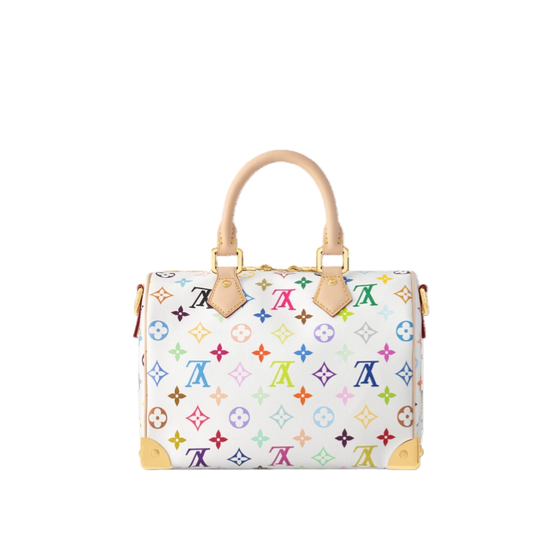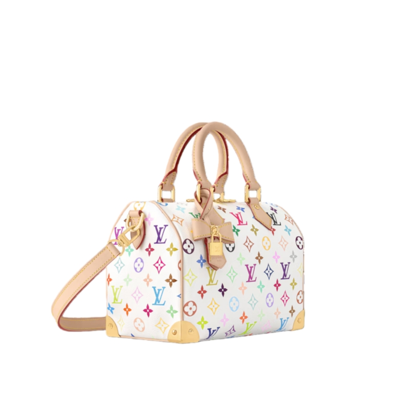 The Speedy Bandoulière 25 handbag makes a spirited statement in the Louis Vuitton x Murakami collection's vibrant version of the iconic Monogram motif, which is refreshed with the Japanese artist’s signature pop-colored palette. This classic design is detailed with two Toron top handles and a removable strap in natural cowhide leather, as well as a playful bow-shaped LV x TM keybell. A golden padlock and corner details nod to the House’s emblematic travel trunks.