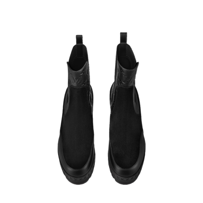 The Laureate platform Chelsea boot is a reinterpretation of one of Louis Vuitton's emblematic styles. It comes in suede calf leather with trim in smooth leather debossed with the Monogram pattern. This model is characterized by its lightweight platform outsole, which is embellished with a pattern of tiny LV Initials inspired by the lozine edging of the House's historic trunks.