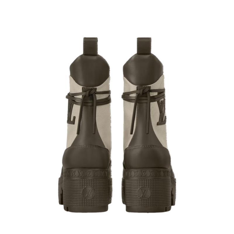 The iconic Laureate platform desert boot is revisited in canvas with calf-leather trim. The color palette and combination of materials give this style a subtle military vibe, complementing its long leather laces and treaded rubber outsole. An LV Initials signature features on the side, while the outsole is decorated with a row of LV Initials.