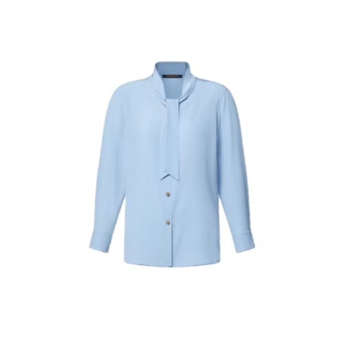 This blouse is effortlessly elegant in airy silk crepe de chine in a soft seasonal shade. The neckline is reworked with trim lavalliere ties, while the front and cuffs are fastened with this season’s domed golden buttons for a polished finish. A Monogram Flower tab discreetly signs the left sleeve.